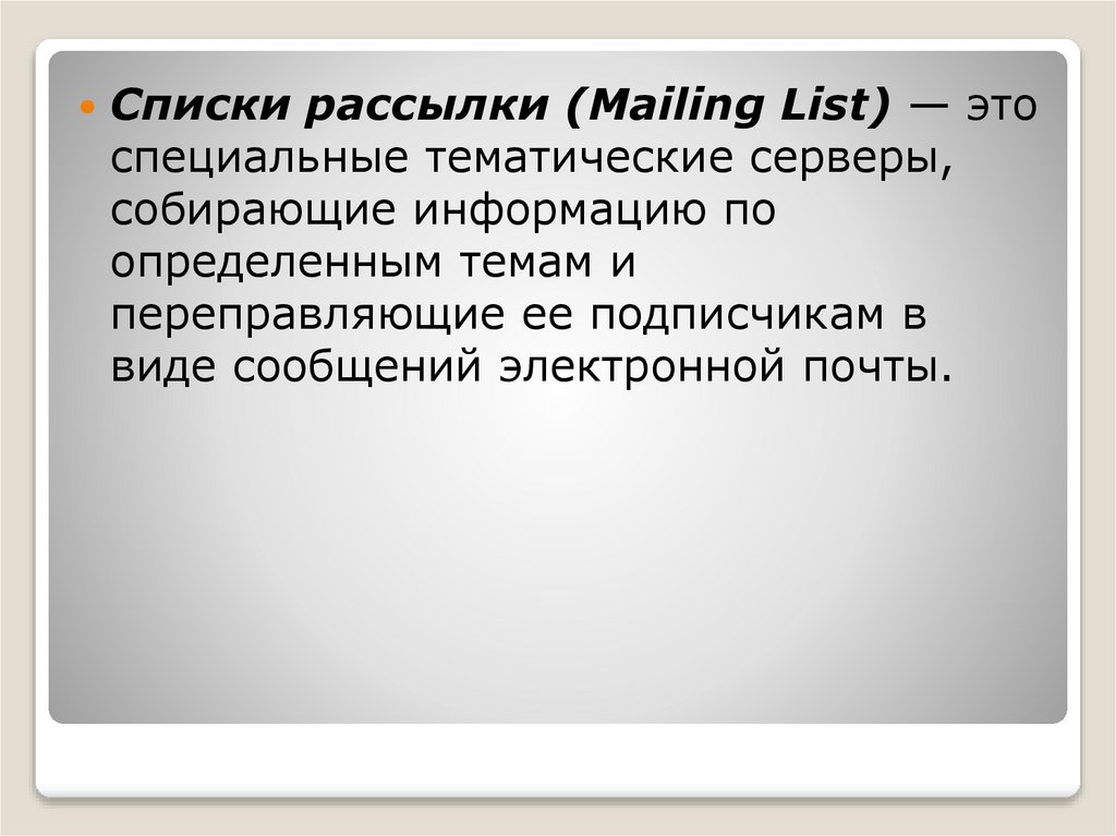 Списки рассылки (Mailing List) — этоспециальные тематические серверы,