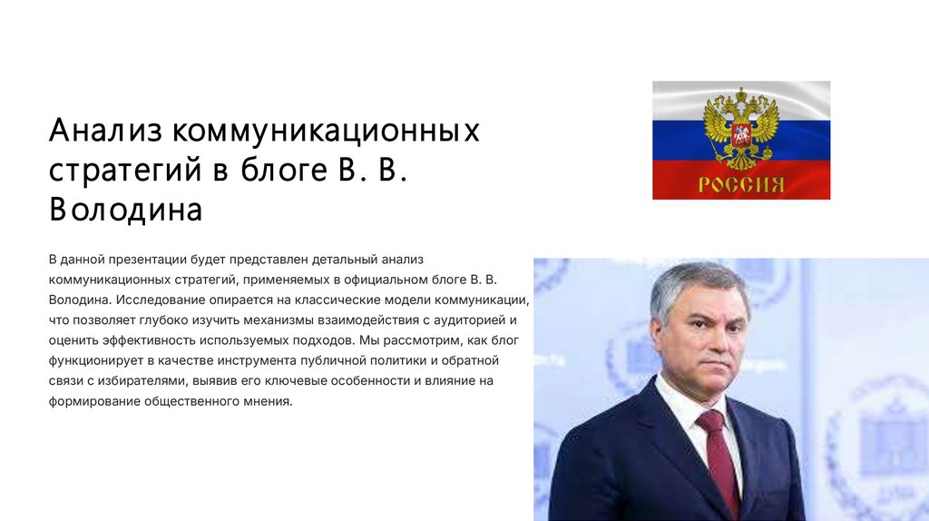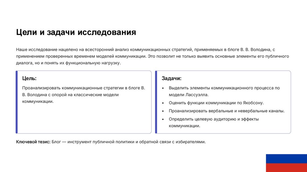 Цели и задачи исследованияНаше исследование нацелено на всесторонний анализ коммуникационных стратегий, применяемых в блоге В. В. Володина, с
