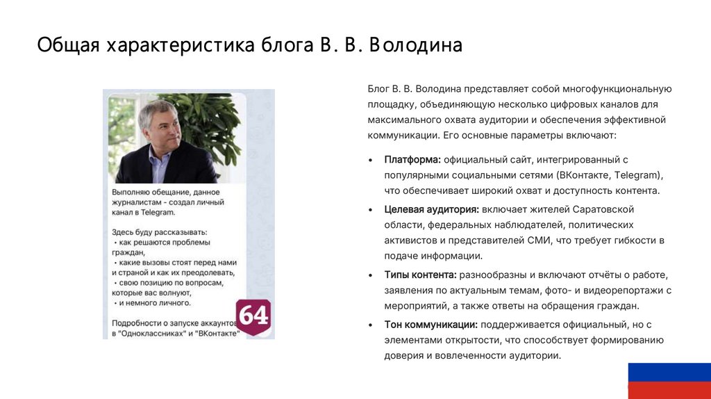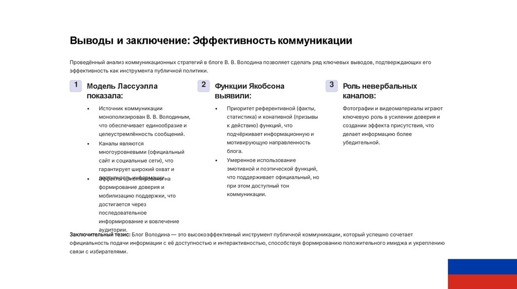 Выводы и заключение: Эффективность коммуникацииПроведённый анализ коммуникационных стратегий в блоге В. В. Володина позволяет сделать ряд ключевых выводов, подтверждающих его