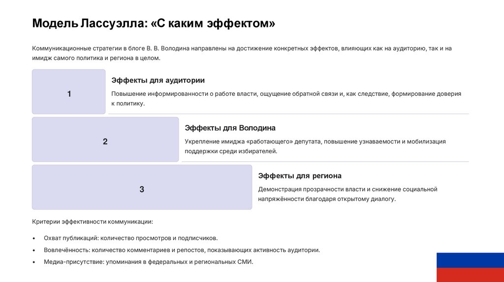 Модель Лассуэлла: «С каким эффектом»Коммуникационные стратегии в блоге В. В. Володина направлены на достижение конкретных эффектов, влияющих как на аудиторию, так и на
