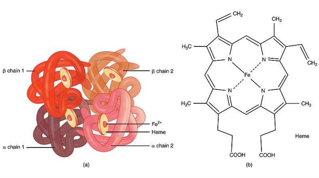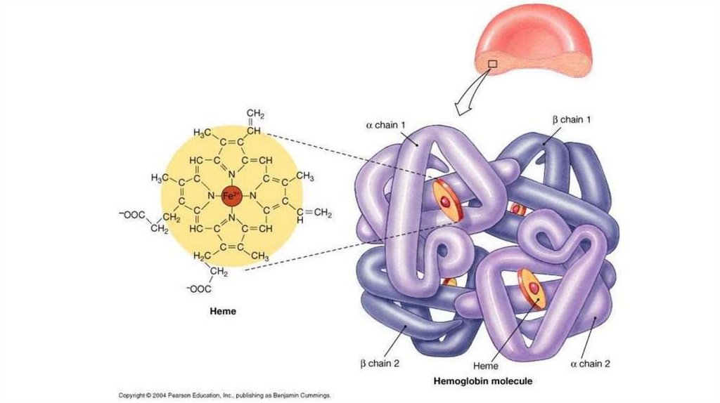 • 4 гема + 2 a- и 2 b- полипептидных цепи• Белок четвертичной структуры