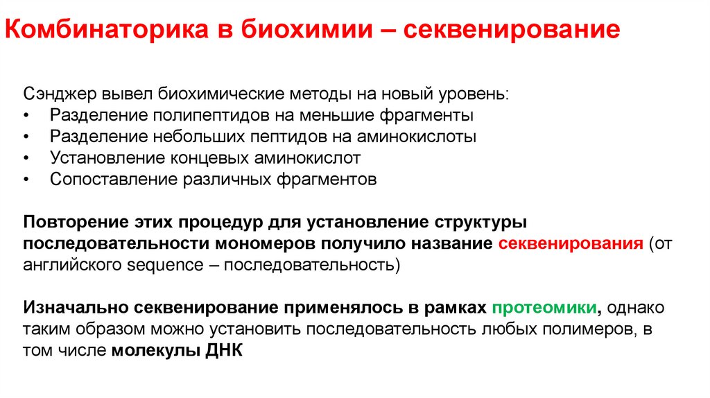 Комбинаторика в биохимии – секвенированиеСэнджер вывел биохимические методы на новый уровень: