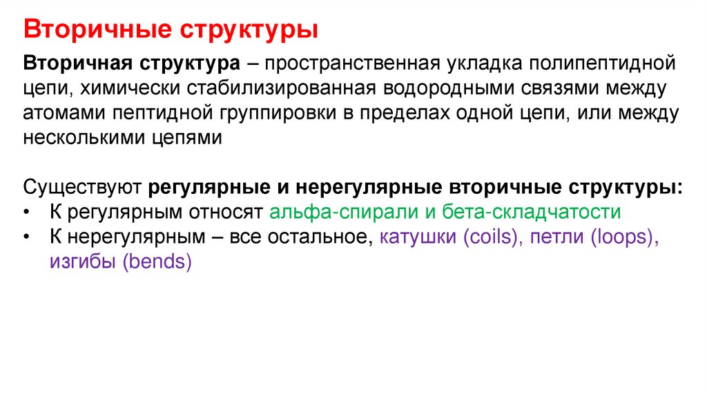 • К нерегулярным – все остальное, катушки (coils), петли (loops),
