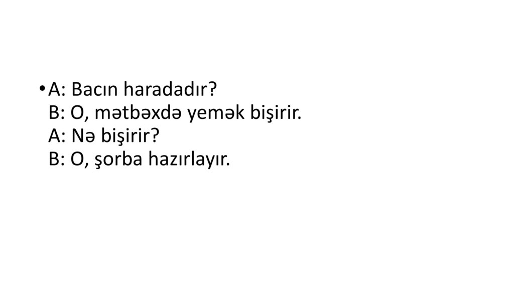 • A: Bacın haradadır?B: O, mətbəxdə yemək bişirir.