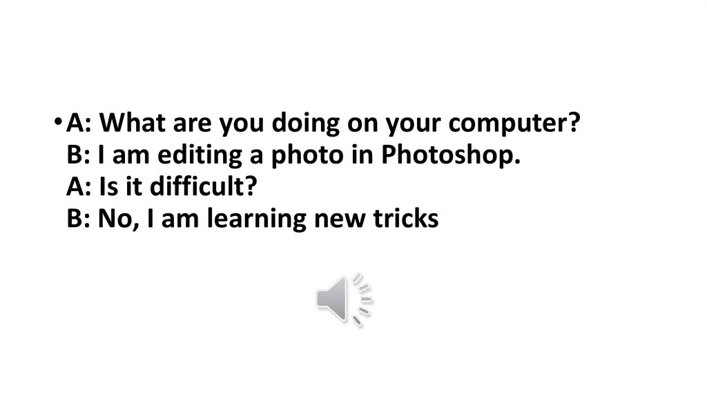 • A: What are you doing on your computer?B: I am editing a photo in Photoshop.
