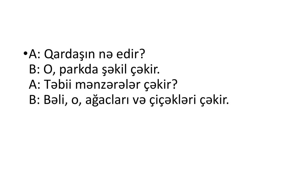 •A: Qardaşın nə edir?B: O, parkda şəkil çəkir.