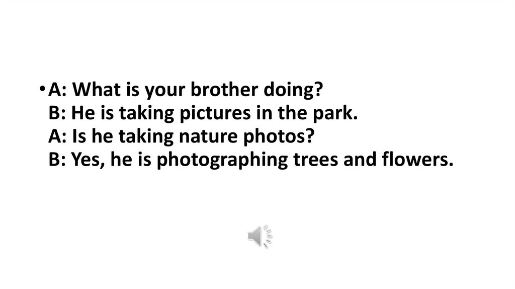 • A: What is your brother doing?B: He is taking pictures in the park.