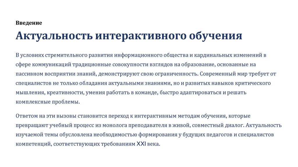 пассивном восприятии знаний, демонстрируют свою ограниченность. Современный мир требует от