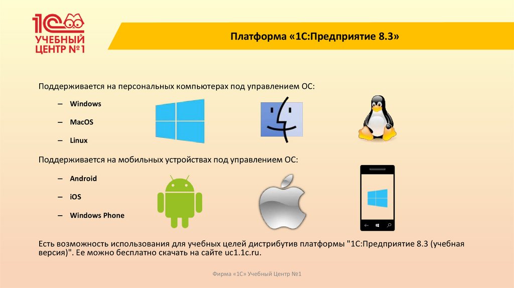 Платформа «1С:Предприятие 8.3»Поддерживается на персональных компьютерах под управлением ОС:
