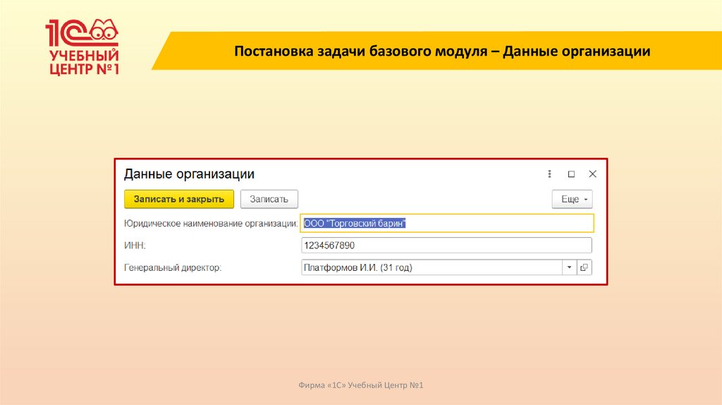 Постановка задачи базового модуля – Данные организацииФирма «1С» Учебный Центр №1