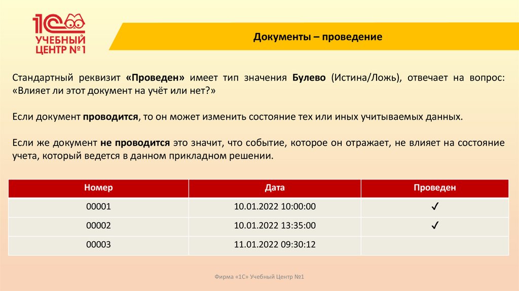 Документы – проведениеСтандартный реквизит «Проведен» имеет тип значения Булево (Истина/Ложь), отвечает на вопрос: