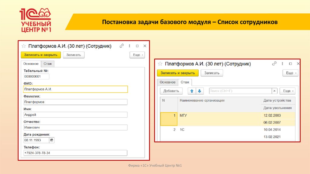 Постановка задачи базового модуля – Список сотрудниковФирма «1С» Учебный Центр №1