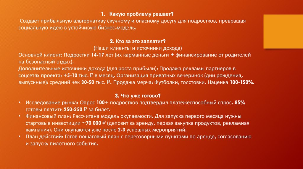 1. Какую проблему решает?Создает прибыльную альтернативу скучному и опасному досугу для подростков, превращая