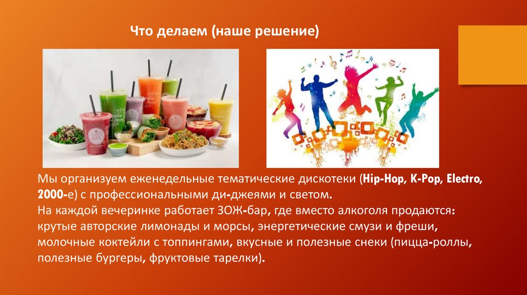 Что делаем (наше решение)Мы организуем еженедельные тематические дискотеки (Hip-Hop, K-Pop, Electro,