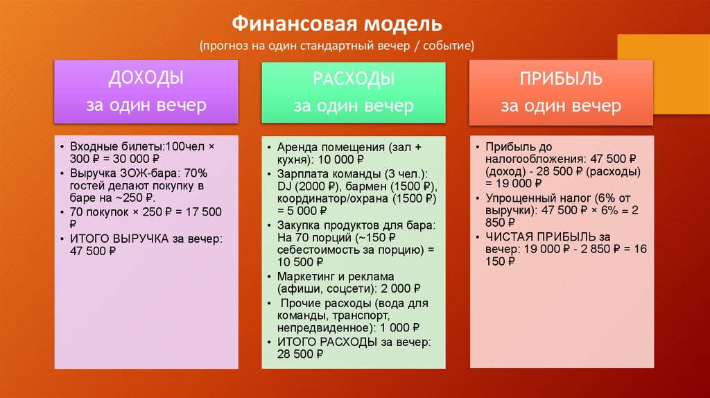 Финансовая модель(прогноз на один стандартный вечер / событие)
