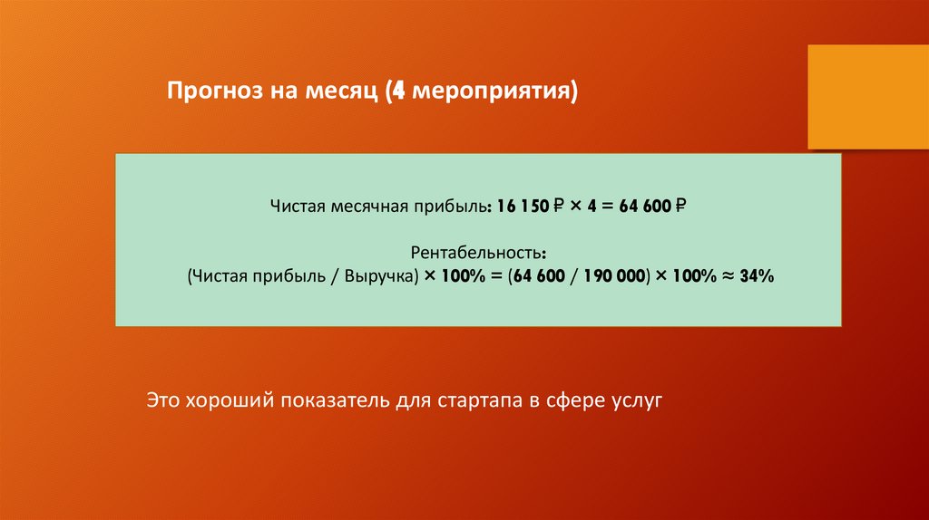 Прогноз на месяц (4 мероприятия)Чистая месячная прибыль: 16 150 ₽ × 4 = 64 600 ₽