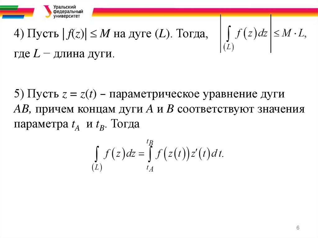 4) Пусть | f(z)| M на дуге (L). Тогда,где L − длина дуги.