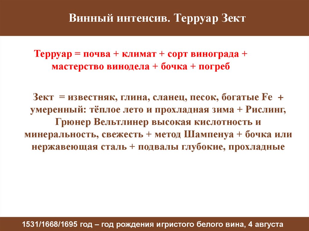 Винный интенсив. Терруар ЗектТерруар = почва + климат + сорт винограда +