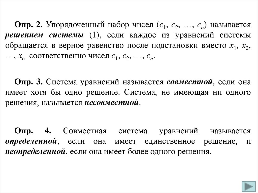 Опр. 2. Упорядоченный набор чисел (c1, c2, …, cn) называетсярешением системы (1), если каждое из уравнений системы