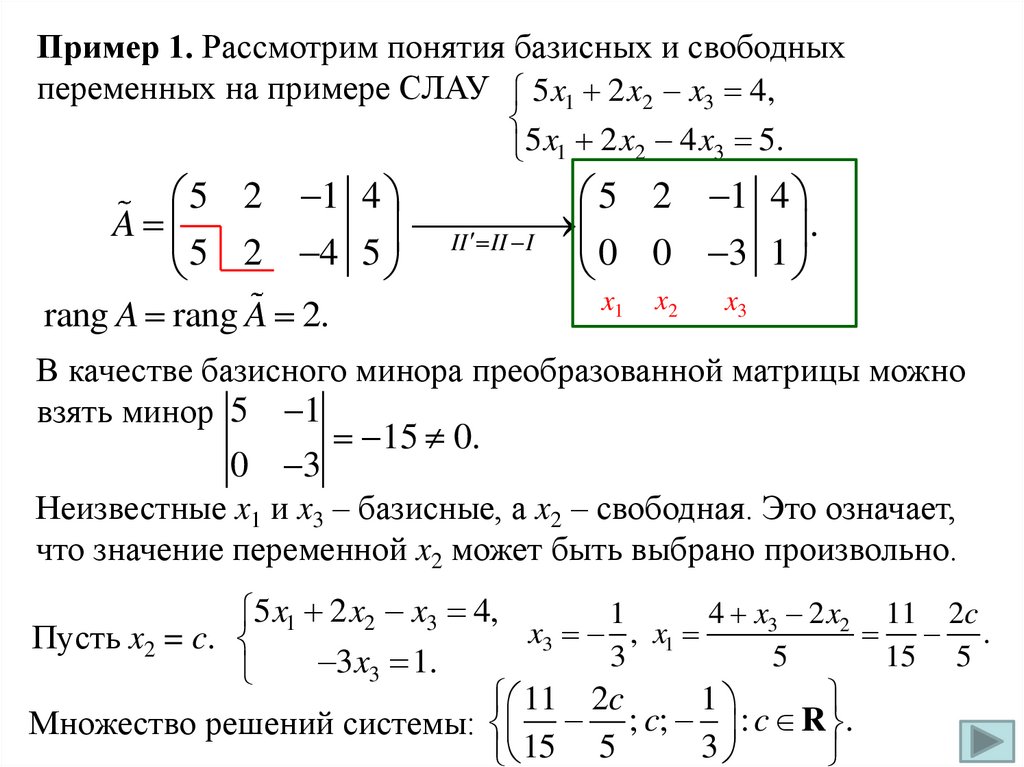 Пример 1. Рассмотрим понятия базисных и свободныхпеременных на примере СЛАУ 5 x1 2 x2 x3 4,