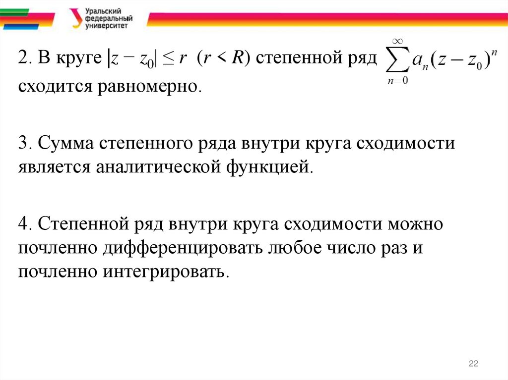 2. В круге |z − z0| ≤ r (r < R) степенной рядсходится равномерно.