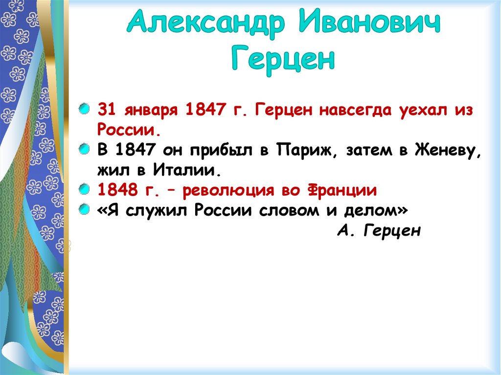 31 января 1847 г. Герцен навсегда уехал изРоссии.