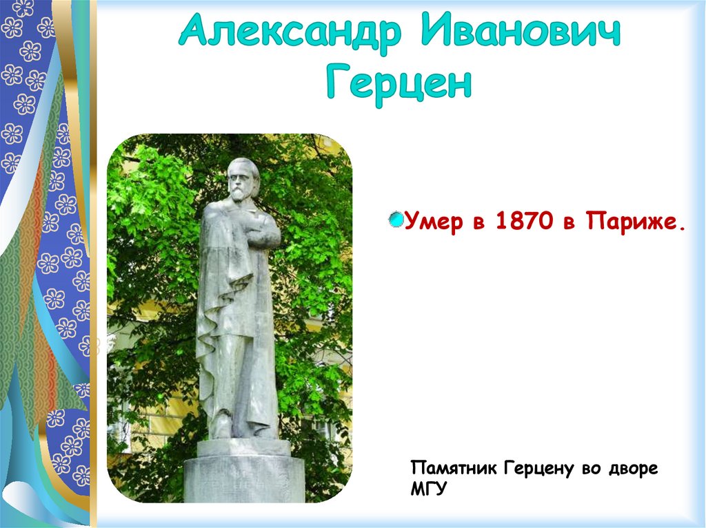 Умер в 1870 в Париже.Памятник Герцену во дворе