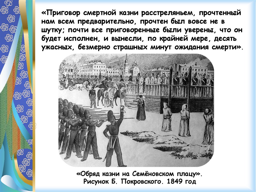 «Приговор смертной казни расстреляньем, прочтенныйнам всем предварительно, прочтен был вовсе не в