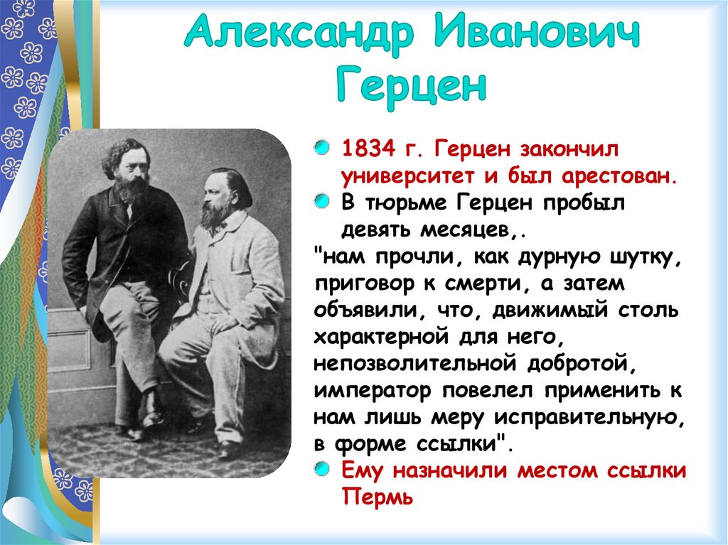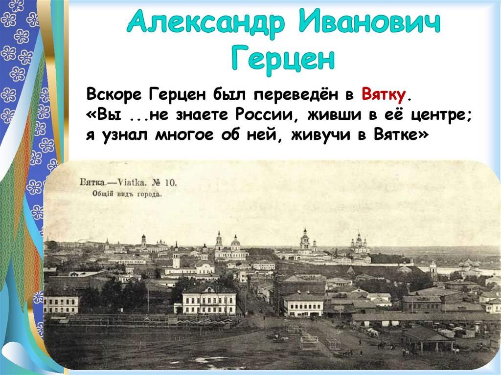 Вскоре Герцен был переведён в Вятку.«Вы ...не знаете России, живши в её центре;