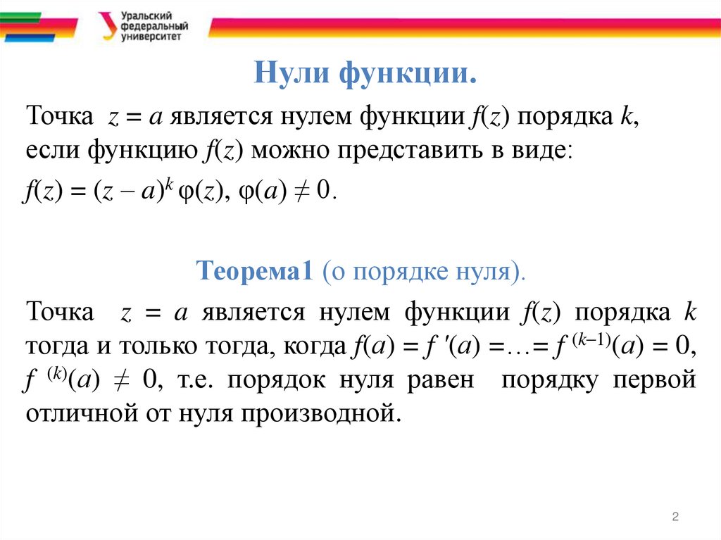 Нули функции.Точка z = a является нулем функции f(z) порядка k,