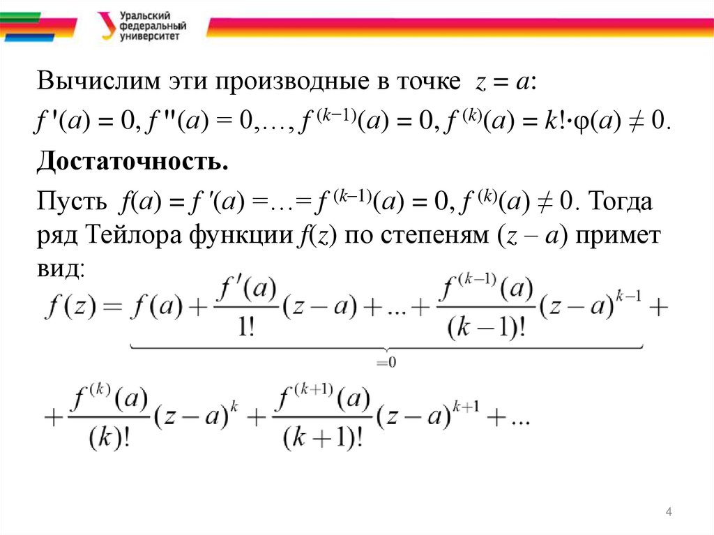 Вычислим эти производные в точке z = a:f '(а) = 0, f ''(а) = 0,…, f (k−1)(а) = 0, f (k)(а) = k!·φ(а) ≠ 0.