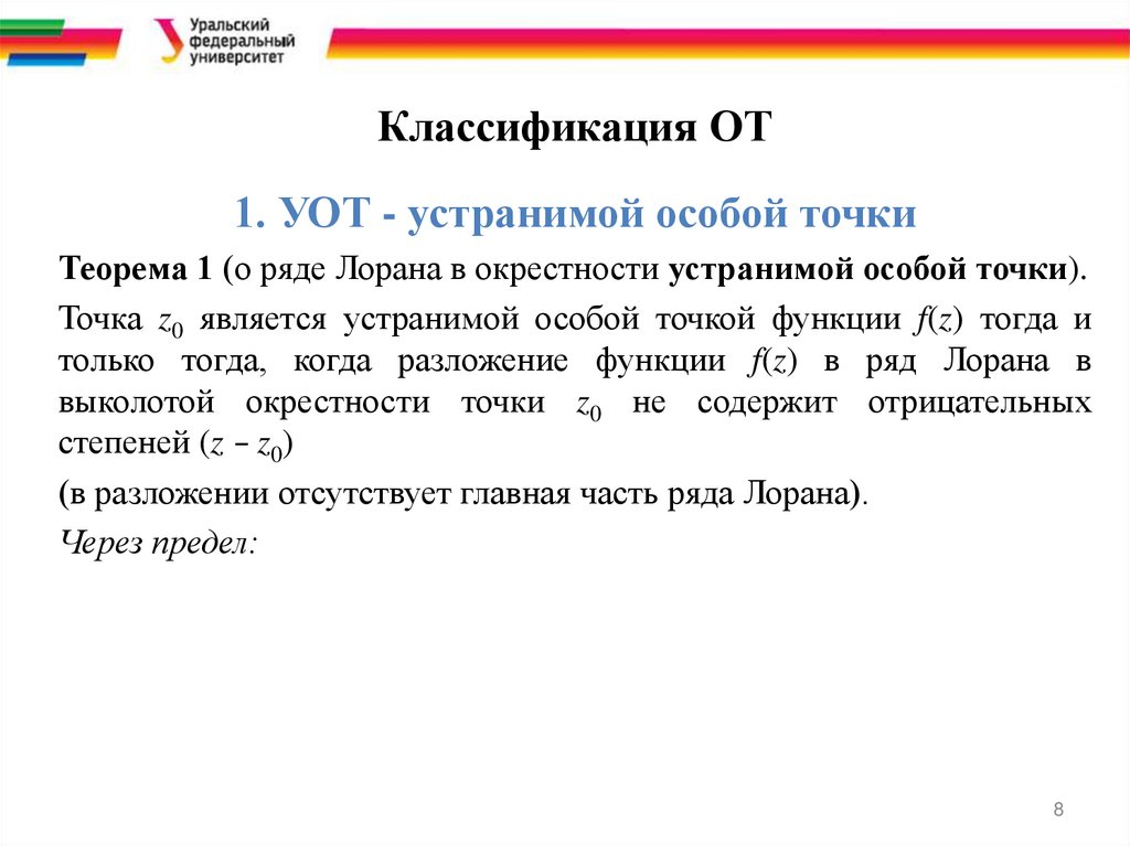 Классификация ОТ1. УОТ - устранимой особой точки