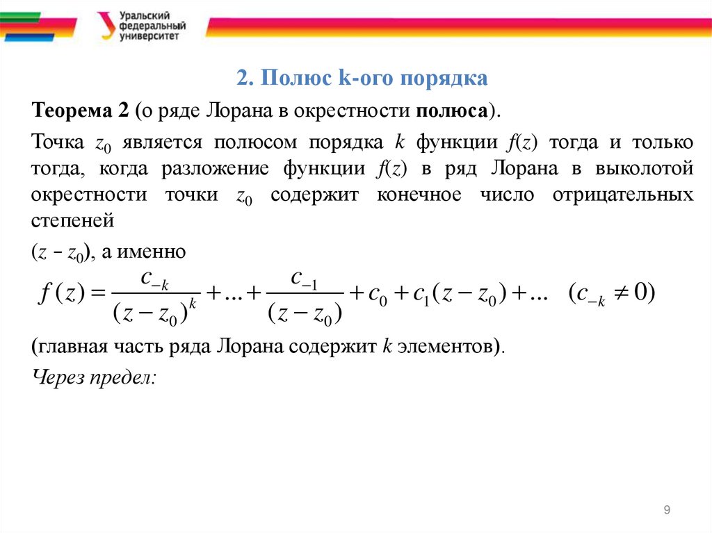 2. Полюс k-ого порядкаТеорема 2 (о ряде Лорана в окрестности полюса).