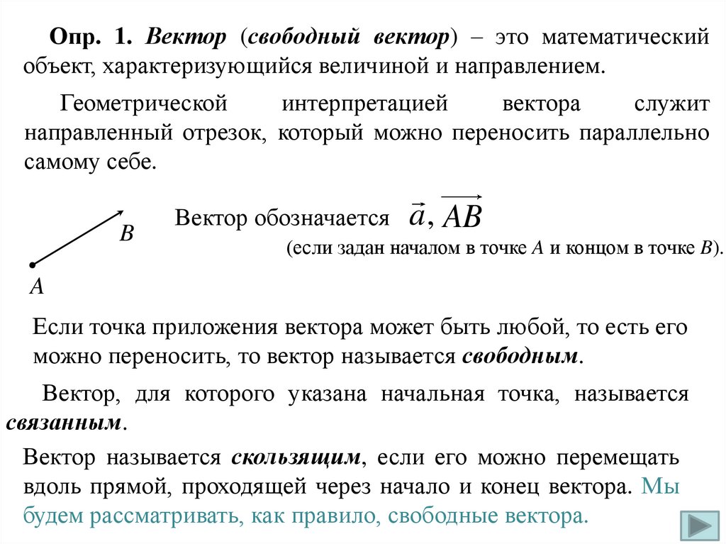 Опр. 1. Вектор (свободный вектор) – это математическийобъект, характеризующийся величиной и направлением.