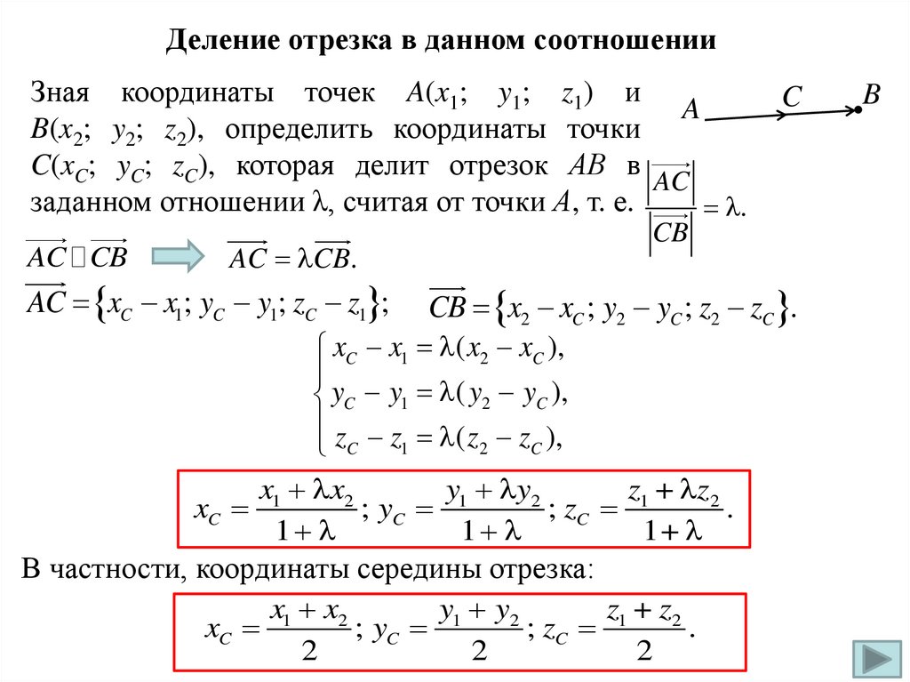 C(xC; yC; zC), которая делит отрезок АВ в