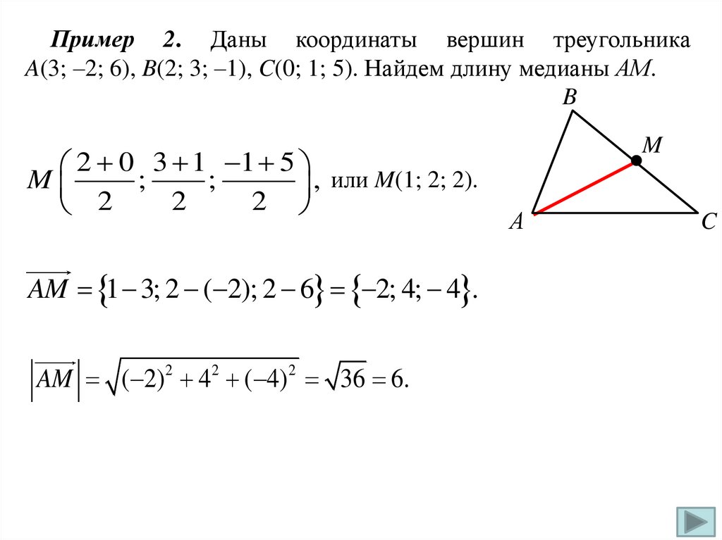 Пример 2. Даны координаты вершин треугольникаA(3; –2; 6), B(2; 3; –1), C(0; 1; 5). Найдем длину медианы АМ.