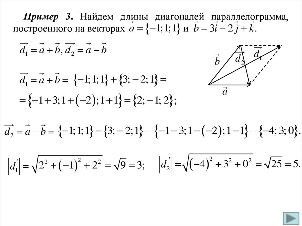 Пример 3. Найдем длины диагоналей параллелограмма,построенного на векторах a 1;1;1 и b 3i 2 j k .