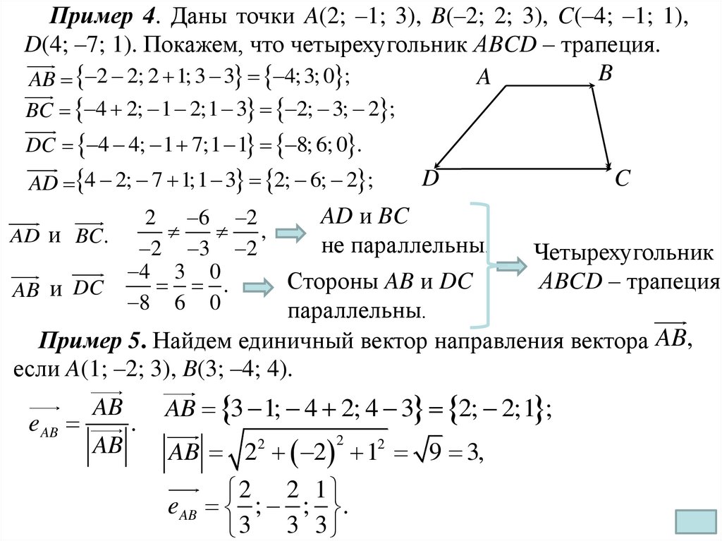 Пример 4. Даны точки A(2; –1; 3), B(–2; 2; 3), C(–4; –1; 1),D(4; –7; 1). Покажем, что четырехугольник АBCD – трапеция.