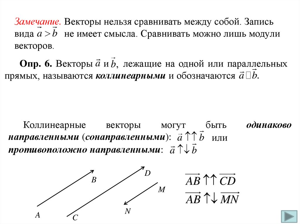Замечание. Векторы нельзя сравнивать между собой. Записьвида a b не имеет смысла. Сравнивать можно лишь модули