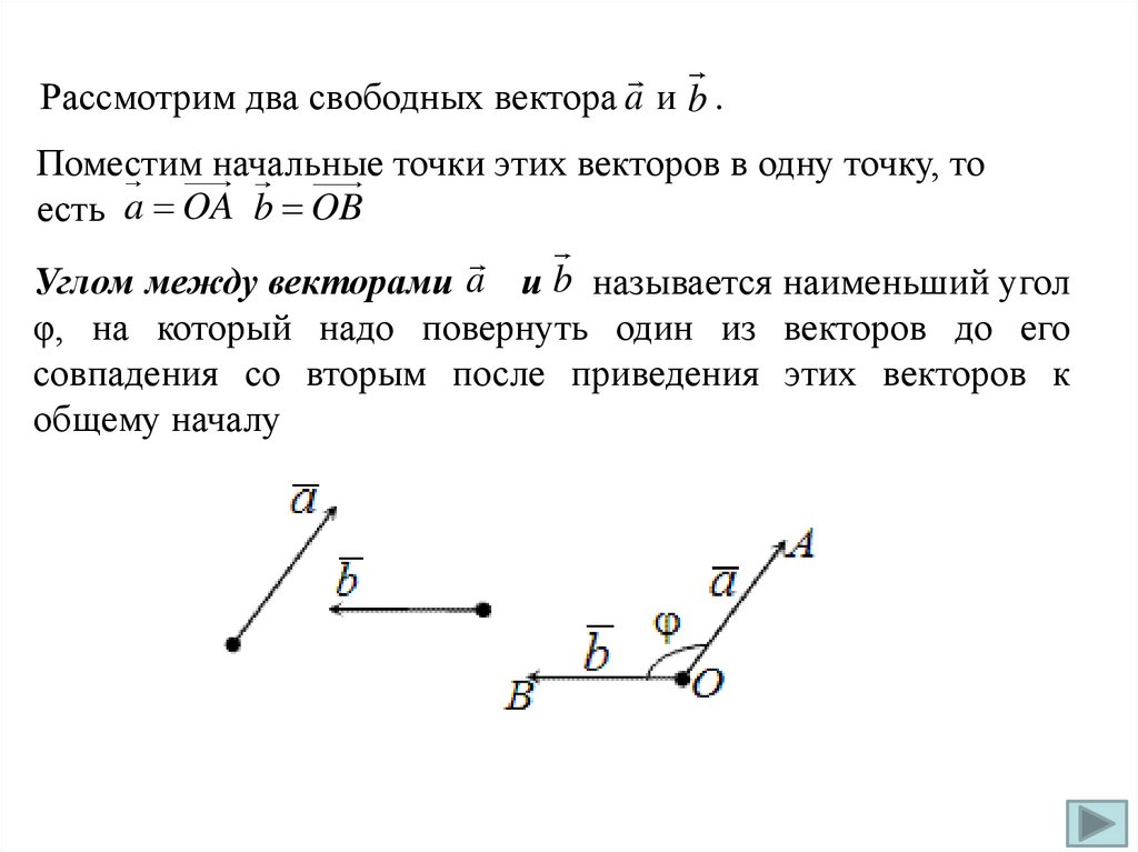 Рассмотрим два свободных вектора a и b .Поместим начальные точки этих векторов в одну точку, то