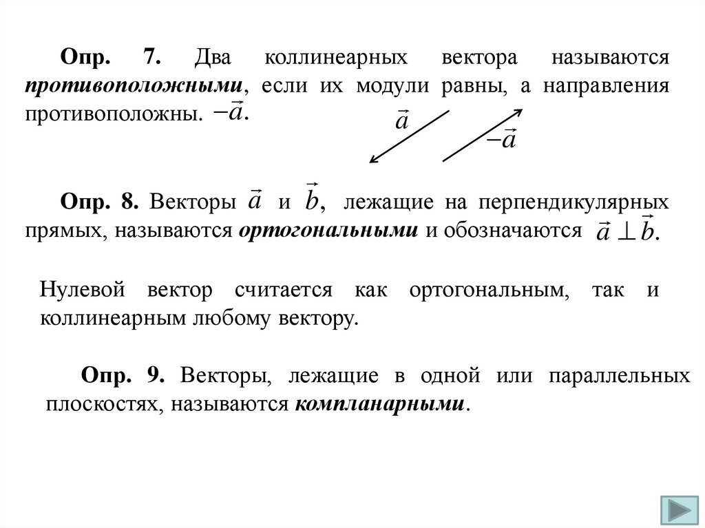 Опр. 7. Два коллинеарных вектора называютсяпротивоположными, если их модули равны, а направления