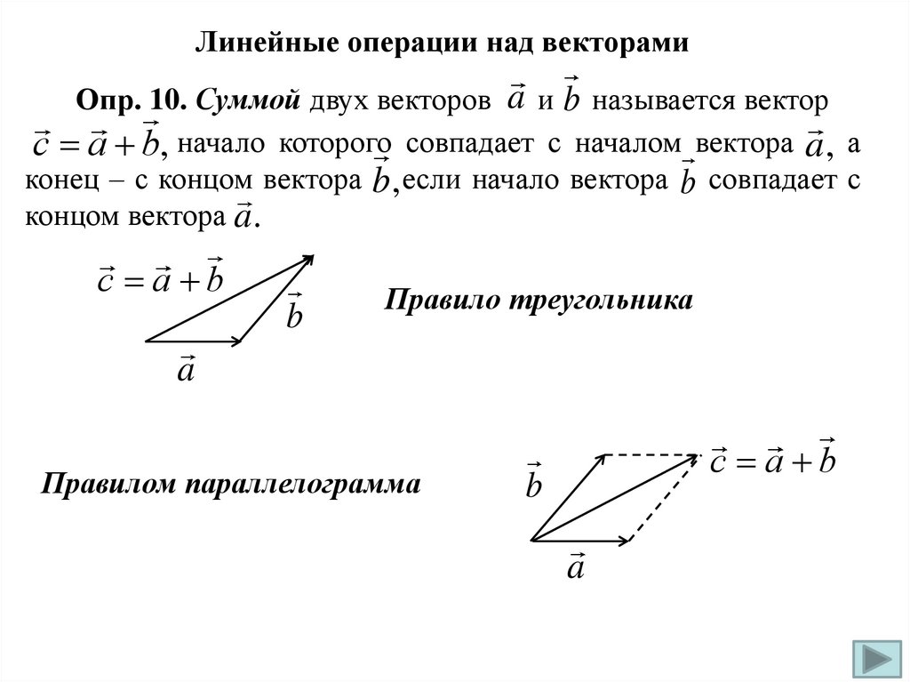 Линейные операции над векторамиОпр. 10. Суммой двух векторов a и b называется вектор