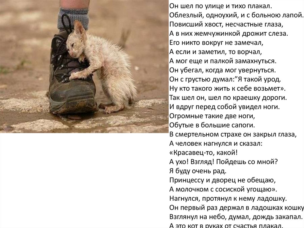 Он шел по улице и тихо плакал.Облезлый, одноухий, и с больною лапой.