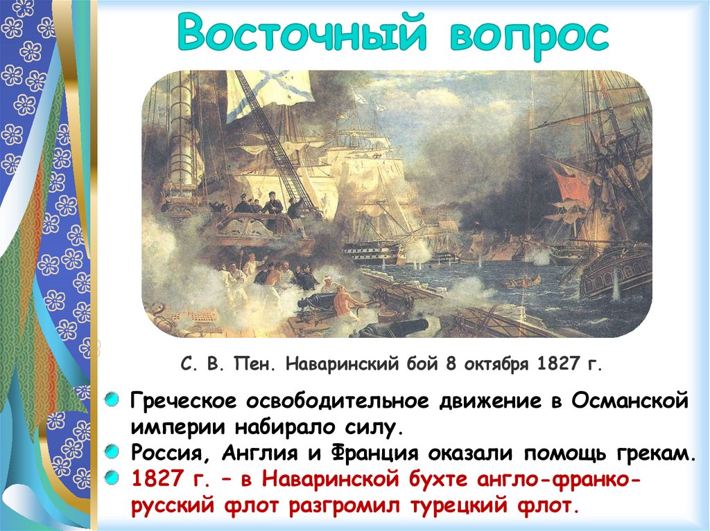 1827 г. – в Наваринской бухте англо-франкорусский флот разгромил турецкий флот.