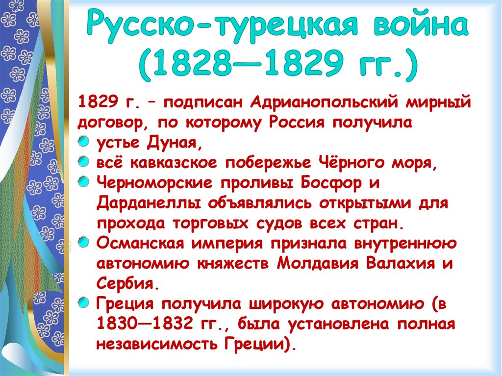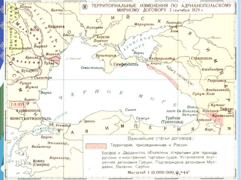 1829 г. – подписан Адрианопольский мирныйдоговор, по которому Россия получила