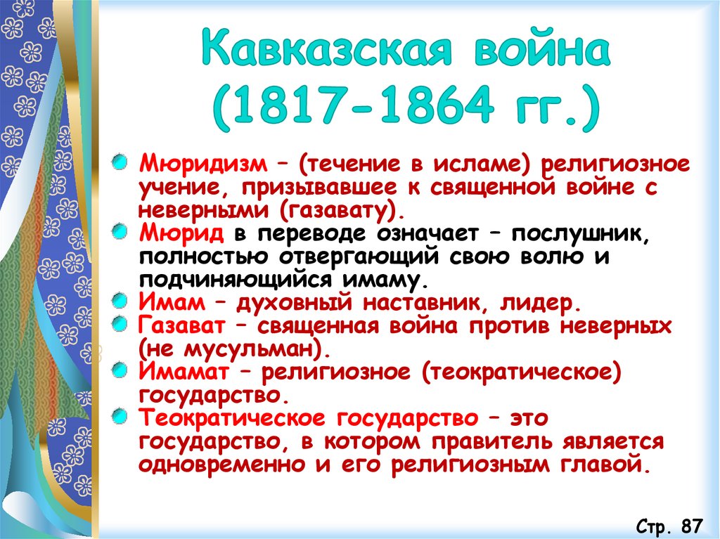 Мюридизм – (течение в исламе) религиозноеучение, призывавшее к священной войне с