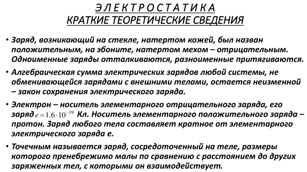 ЭЛЕКТРОСТАТИКАКРАТКИЕ ТЕОРЕТИЧЕСКИЕ СВЕДЕНИЯ