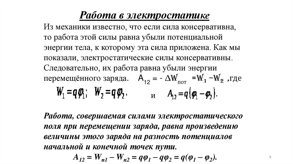 Работа в электростатикеИз механики известно, что если сила консервативна,