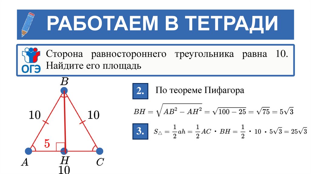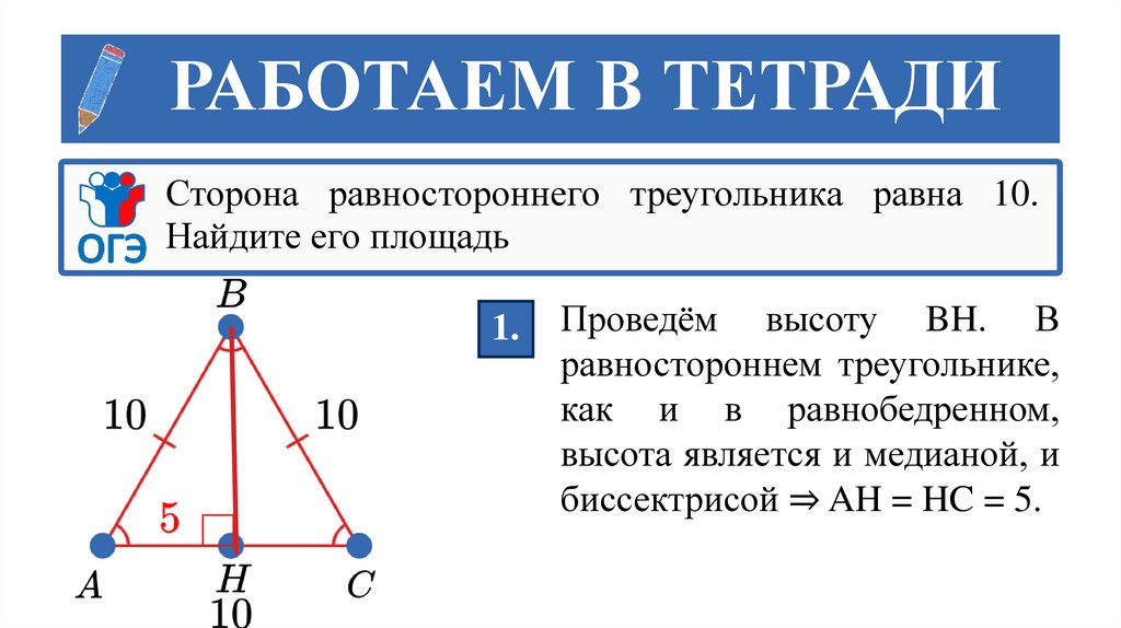 РАБОТАЕМ В ТЕТРАДИСторона равностороннего треугольника равна 10.