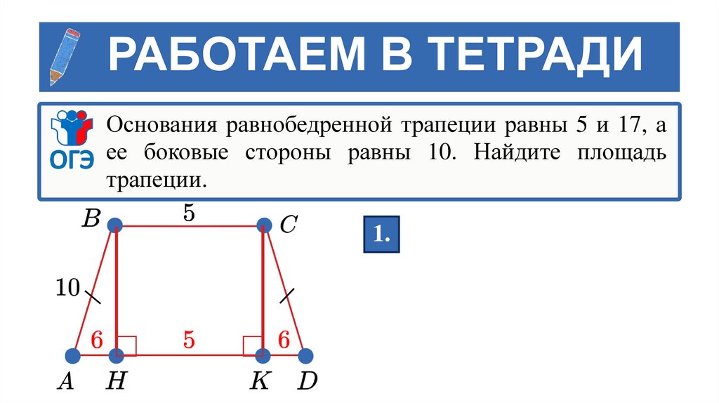 РАБОТАЕМ В ТЕТРАДИОснования равнобедренной трапеции равны 5 и 17, а